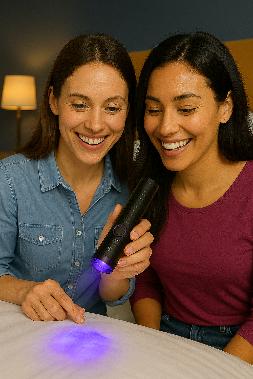 GlowMate is a compact, travel-friendly UV torch that reveals hidden stains, dirt, and fluids on hotel beds, bathrooms, or other surfaces — giving you peace of mind wherever you go.