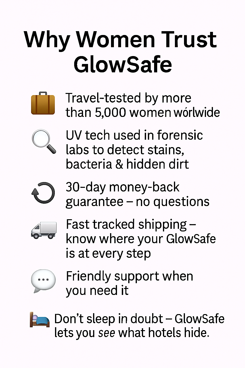 GlowSafe isn't just a flashlight it's peace of mind in your pocket. From solo travelers to busy moms, thousands of women rely on GlowSafe to check for hidden stains, bacteria, and bed bugs in hotels, rentals, and beyond.